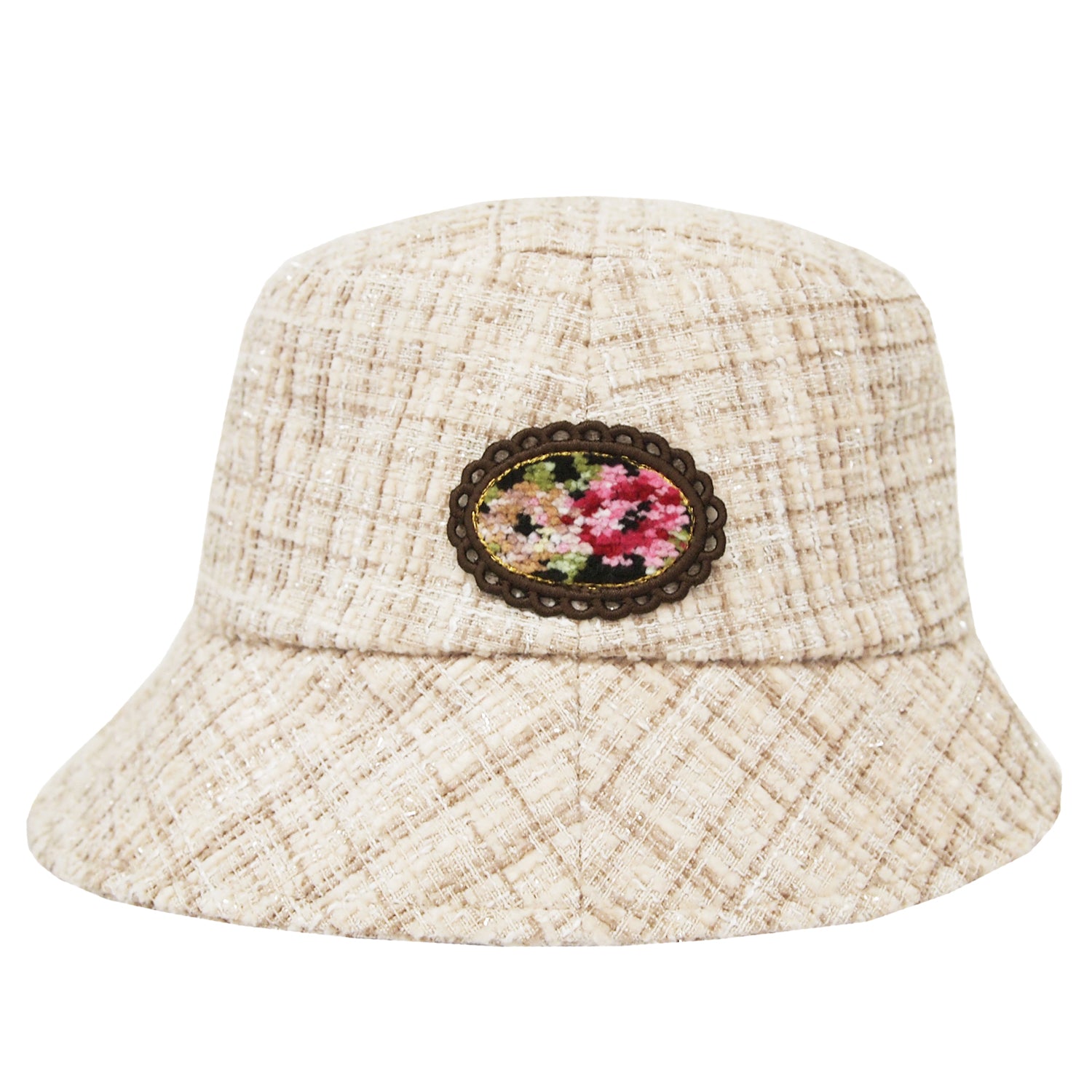 秋冬のコーディネートにピッタリなファンシーツイード生地のハット♪ローズ柄シェニール織ワッペンが花を添えます!【サイズ】〈頭囲〉約56~57.5cm(サイズ調節機能付き)【重さ】75g【素材】〈本体〉ポリエステル、レーヨン、綿〈柄部分〉綿(シェニール織)【中国製】