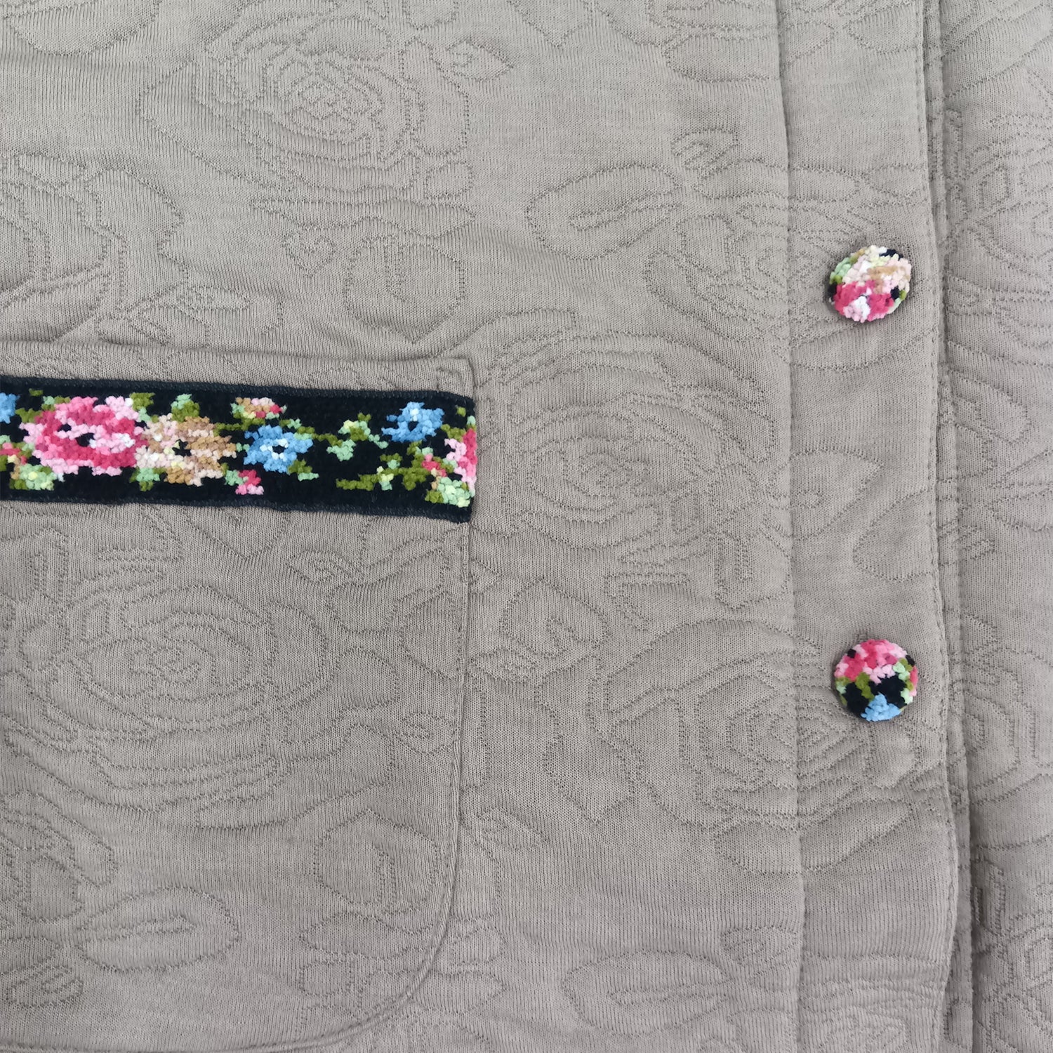 ポケット部分の華やかなシェニール織テープとくるみ釦がアクセント♪