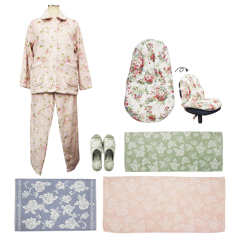 背もたれつきのシートクッションにヒール付きスリッパ、ローズ柄ジャカードマット、ふんわりフェイスタオル・バスタオルのセットです!